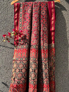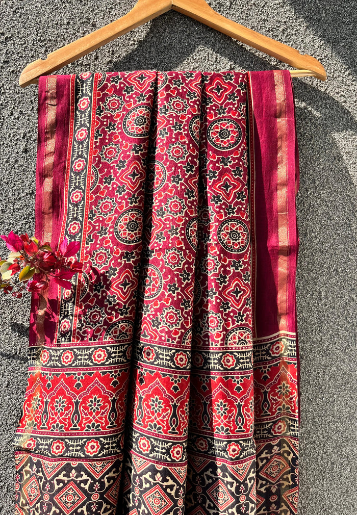 - Technique: Ajrakh is a traditional Indian textile art form that uses wooden blocks and natural dyes to create intricate patterns on fabric