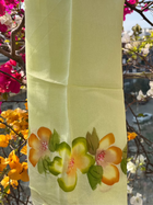- Diamond chiffon saree on a lime base, laden with shaded orange and green flowers all over. The saree comes with a running blouse piece in Italian Crepe.