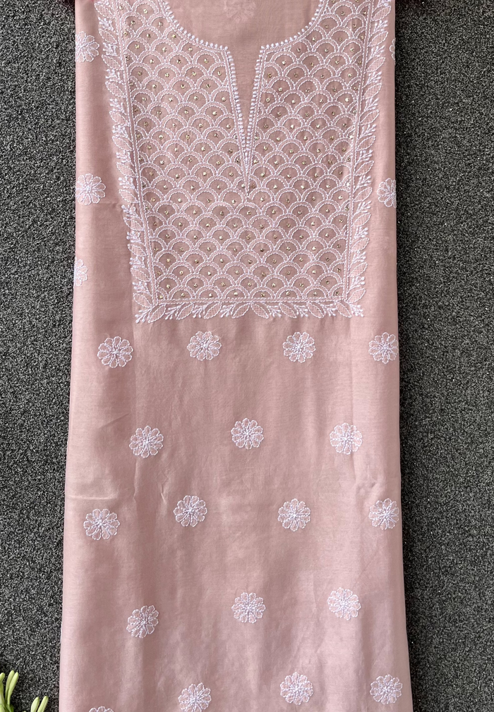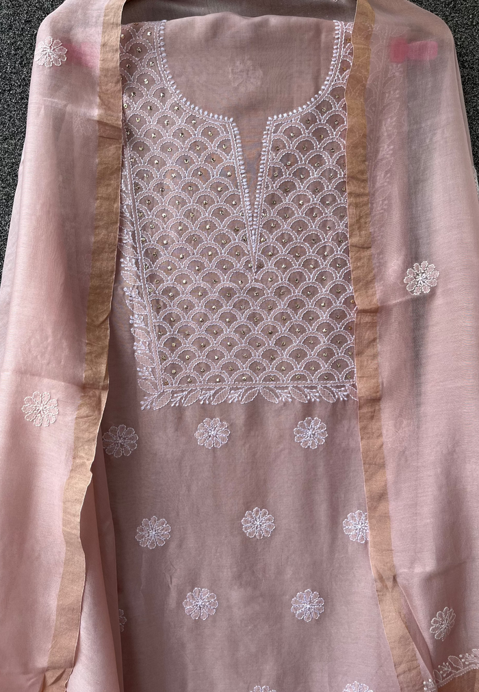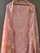 - Two piece unstitched Chikankari kurta set with Mukaish work on yoke
