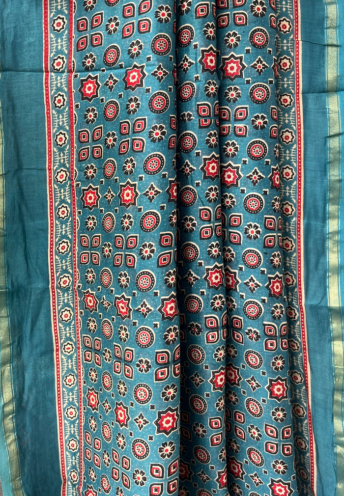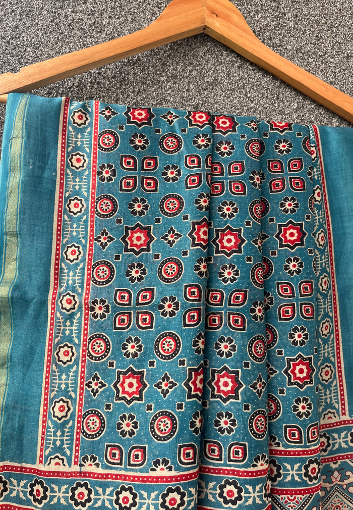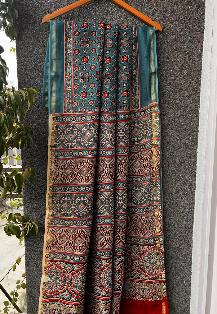 - Technique: Ajrakh is a traditional Indian textile art form that uses wooden blocks and natural dyes to create intricate patterns on fabric