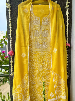 Yellow Kota Unstitched Chikankari & Pearl Festive 2 pc Suit Set