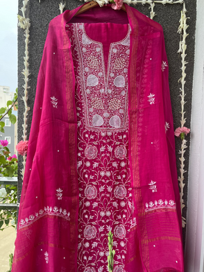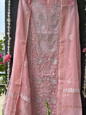Pink Mul Chanderi Unstitched Chikankari & Pearl Festive 2 pc Suit Set