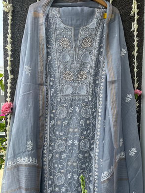 Cool Grey Mul Chanderi Unstitched Chikankari & Pearl Festive 2 pc Suit Set