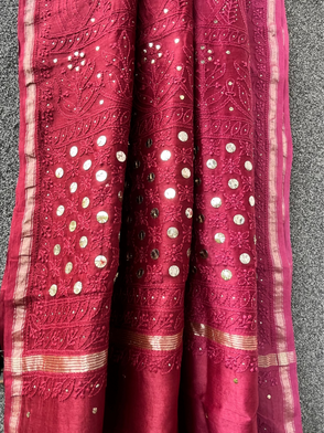 Burgundy Ombre Chikankari Chanderi Saree with Mukaish work