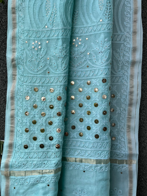 Sea Green Ombre Chikankari Chanderi Saree with Mukaish work